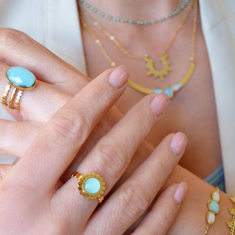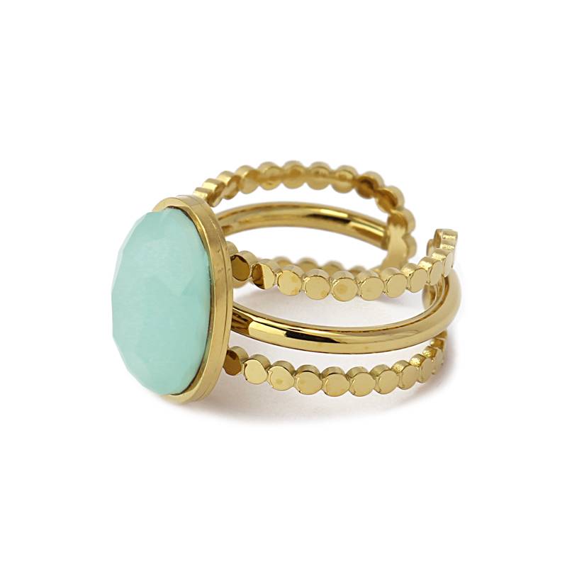 Anillo acero triple bañado en oro con opalo verde claro. Este anillo está abierto para que se pueda ajustar de una talla 12 a 14.