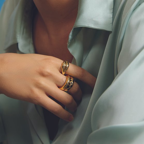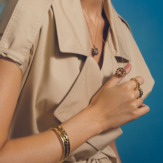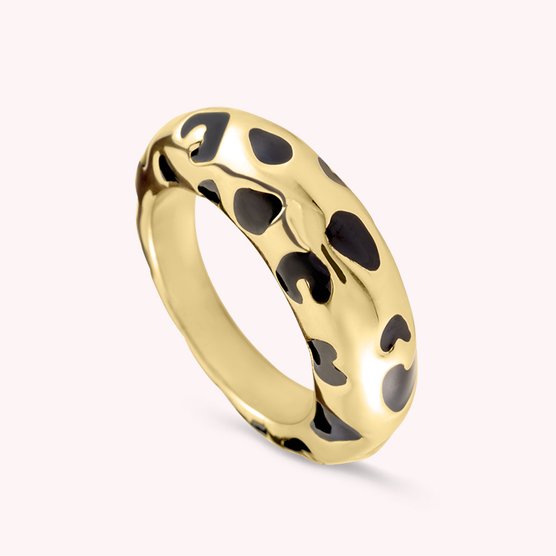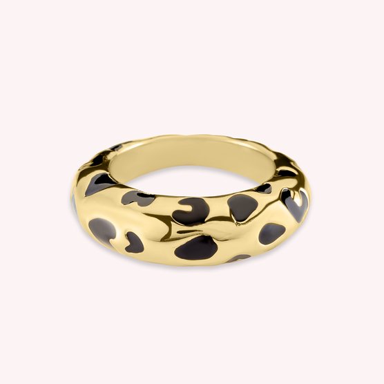 Anillo bañado en oro de 18k. Un anillo ideal para llevar toda la temporada; tú decides si prefieres el dorado liso que combina con todo o el esmaltado estampado de leopardo en negro que atrapará todas las miradas. ¿Un must? Combínalo con el resto de anillos de la colección y apuesta por un total look ganador.