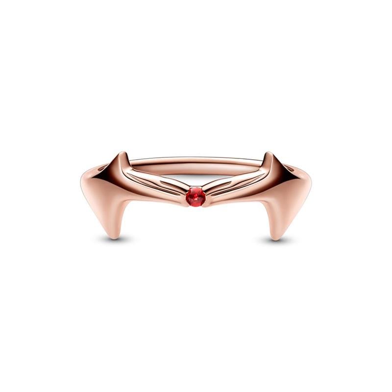 Anillo Pandora Bruja Escarlata para mujer de la colección Marvel fabricado en aleación de metales bañados en oro rosa de 14Kt con una circonita roja en su parte central.