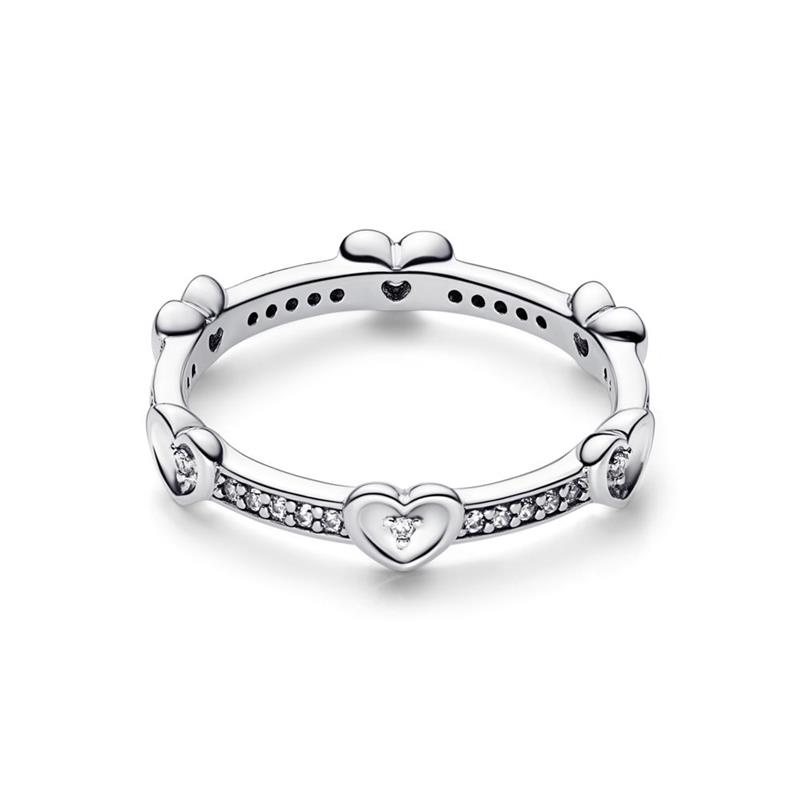 Anillo Pandora Corazones Radiantes Brillantes para mujer fabricado en plata de primera ley compuesto por varias piezas en forma de corazones con circonitas brillantes.
