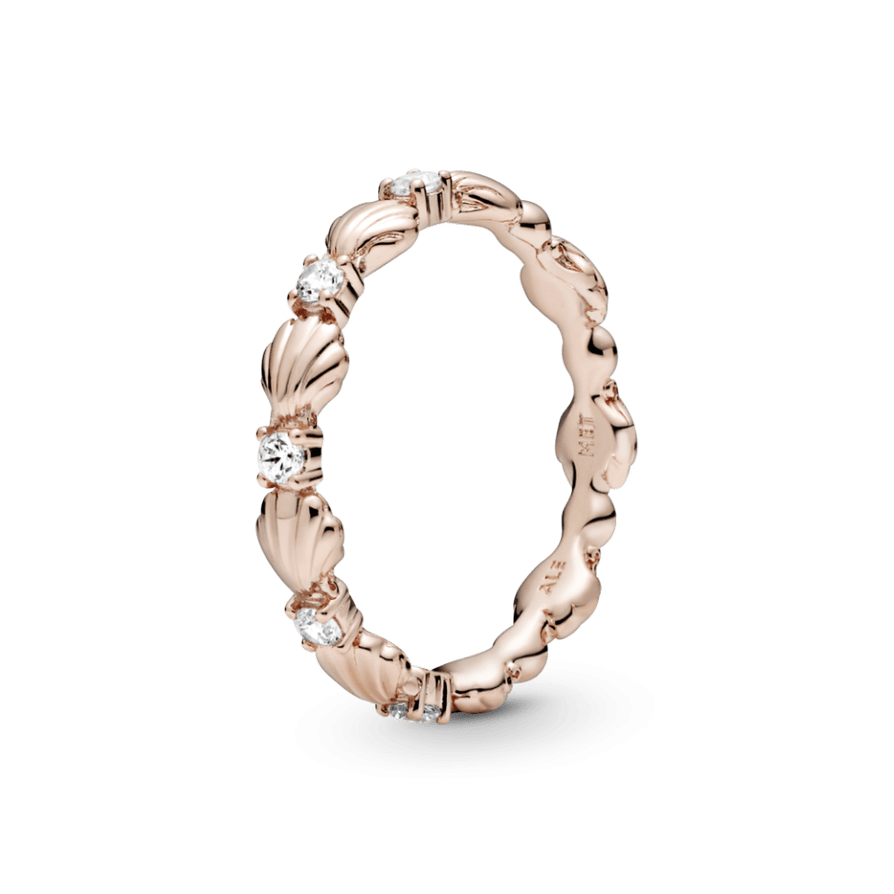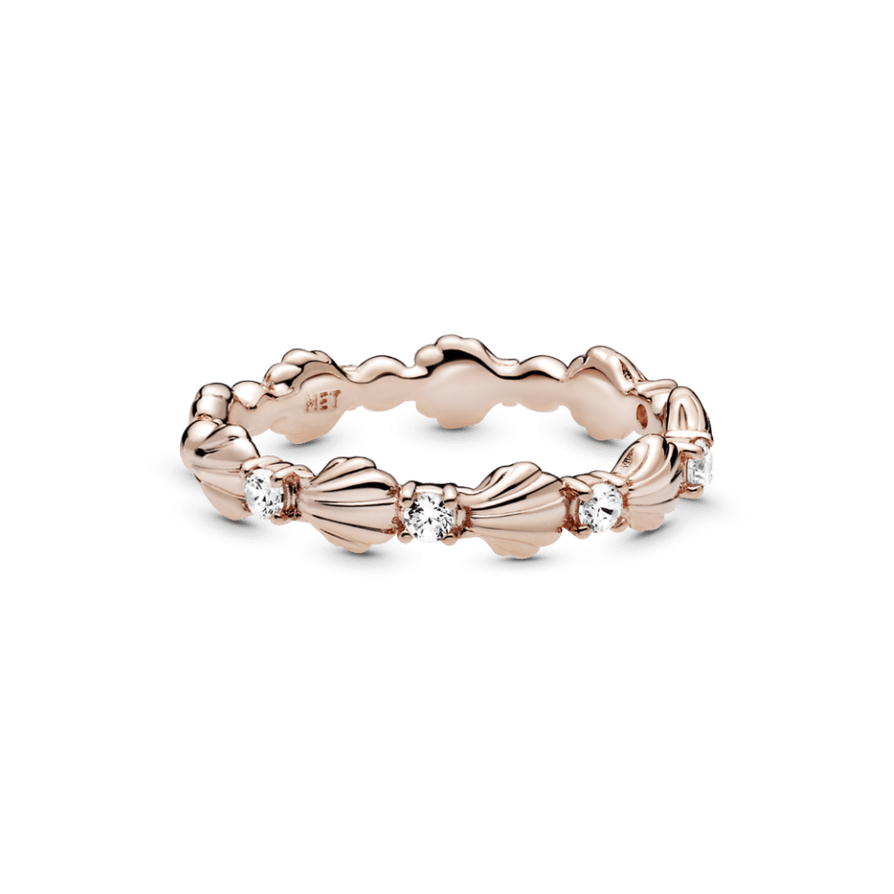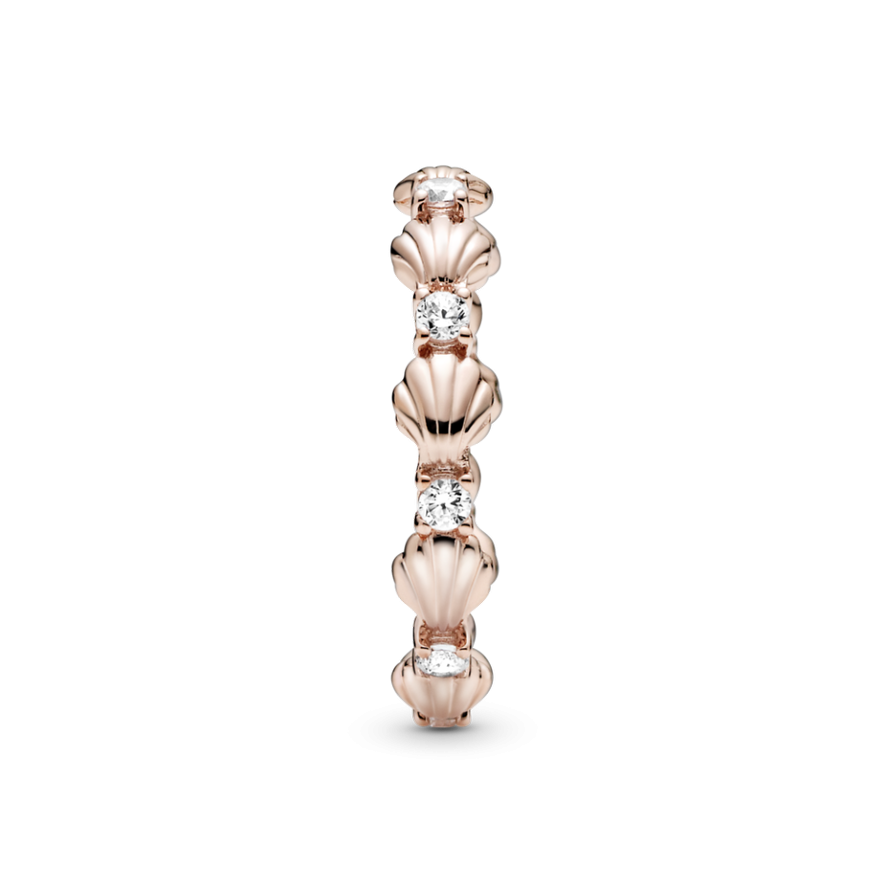 Anillo Pandora Rosé Banda Concha Brillante. Acabado a mano, este anillo de concha se presenta embellecido con cinco circonitas cúbicas transparentes de talla brillante con engastes en grano situadas en la línea de conchas. Puedes ponértelo solo o combinarlo con otros anillos.
