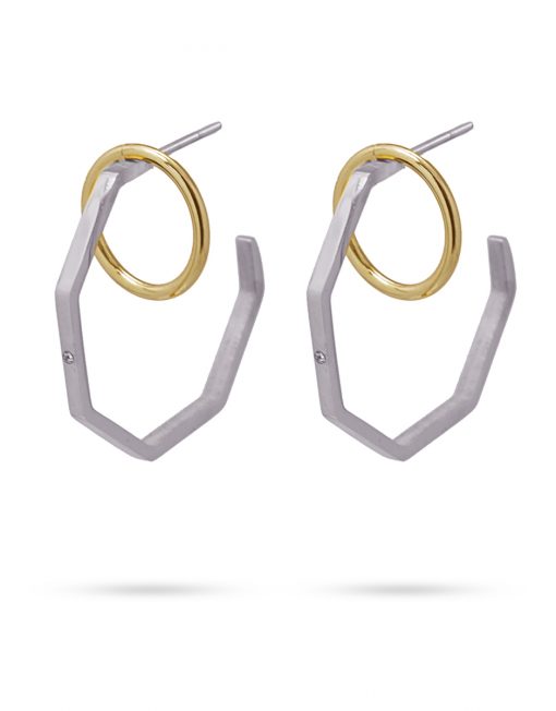 Originales pendientes tipo aros formados por octágono y mini círculo transversal. Están realizados en acero quirúrgico bicolor (dorado y plateado). Ideales si lo que quieres es un look minimalista y sofisticado. Disponibles en dos combinaciones de color.  Miden 28 mm y llevan pasador con cierre  presión tipo mariposa. No producen alergia y se pueden mojar.