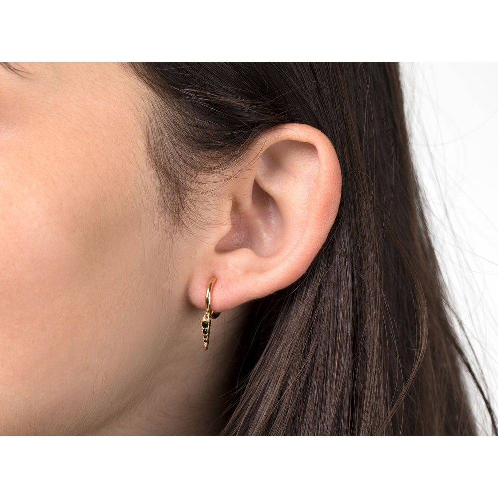 Pendiente aro de 11mm en plata chapados en oro con charm triangulo con circonitas negras.