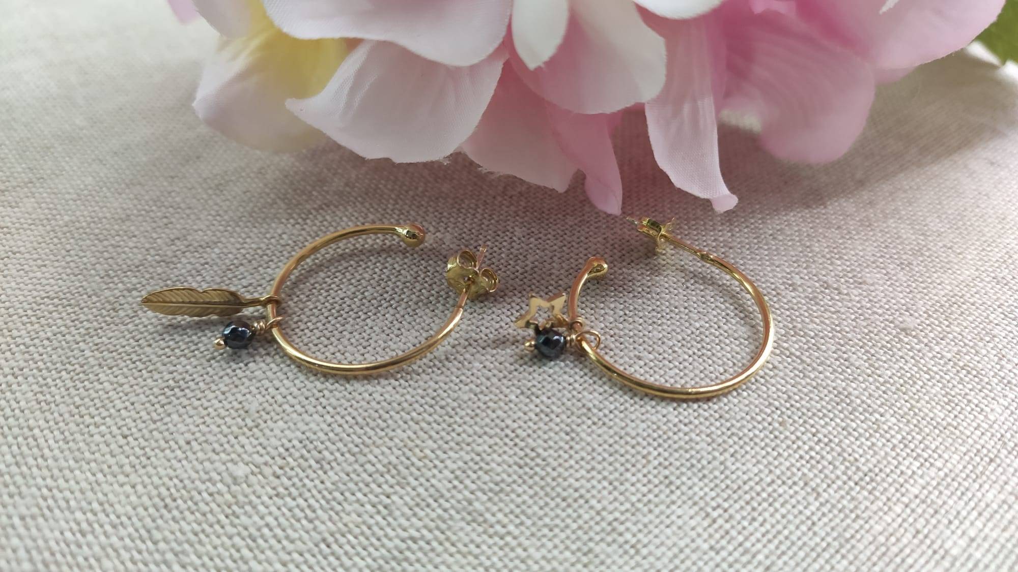 Aros de plata bañada en oro con pluma, estrella y hematites.