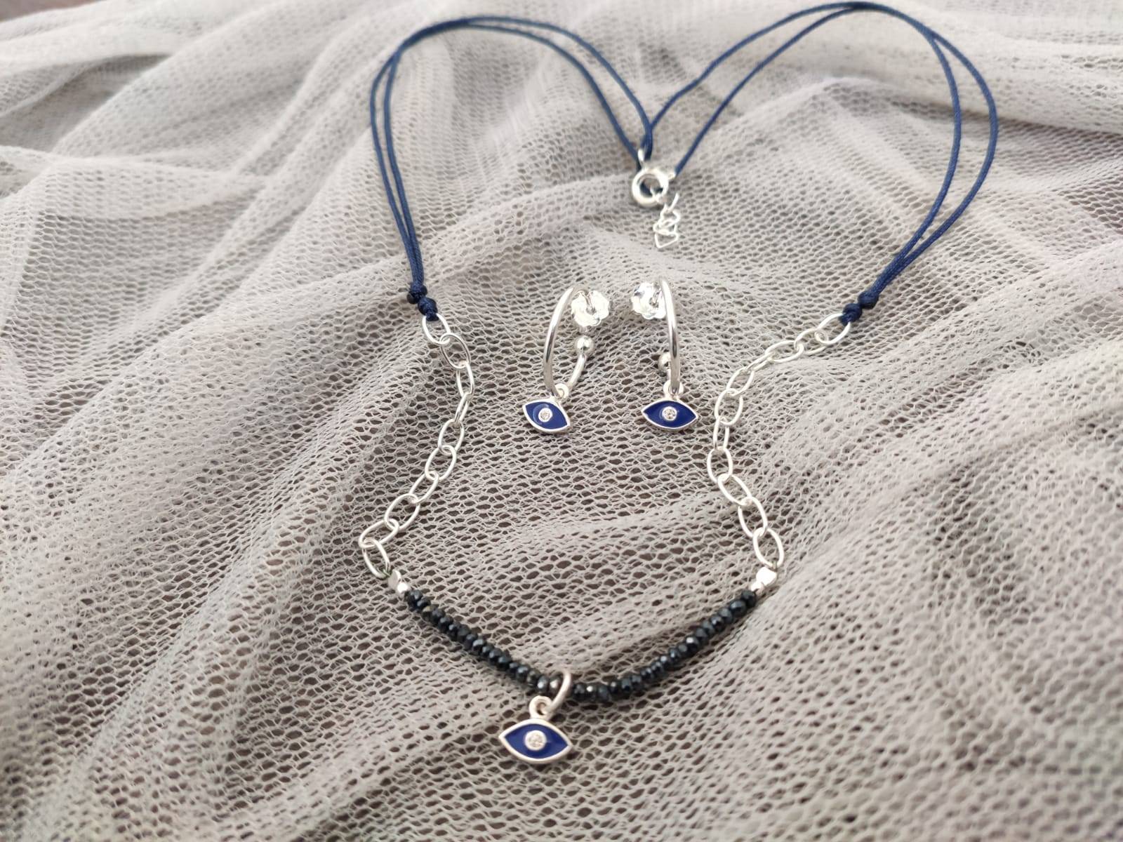 Aros de plata con mini colgante de ojo en plata con esmalte azul