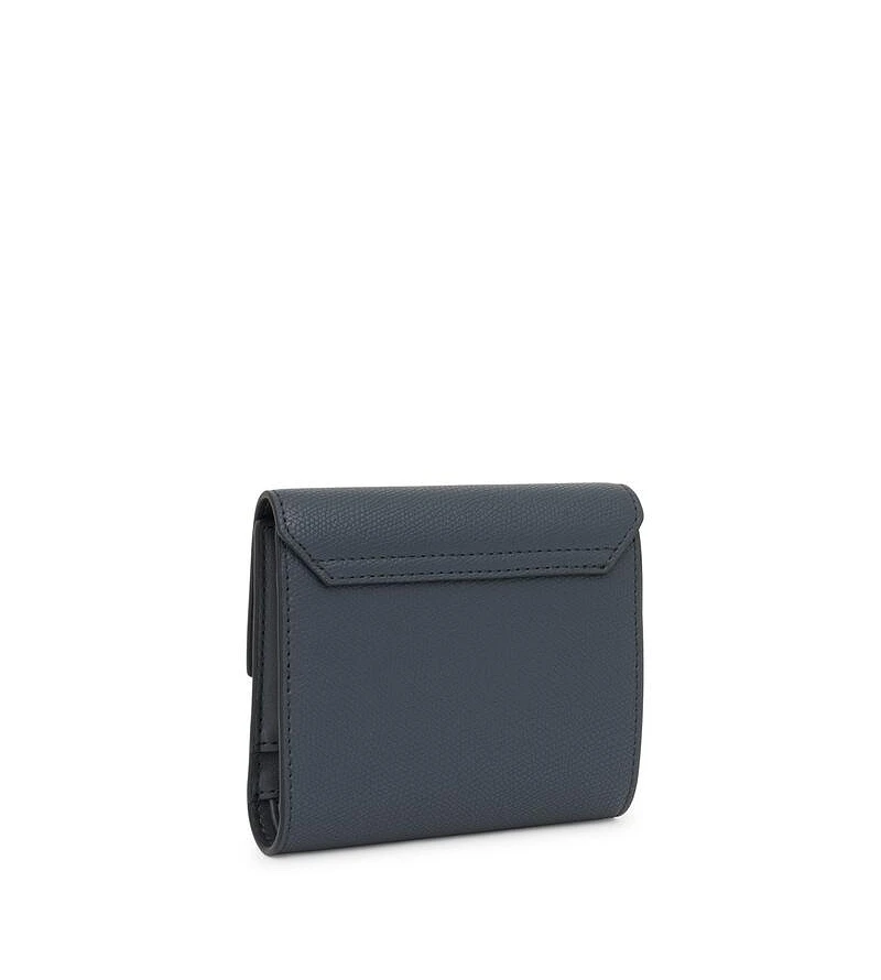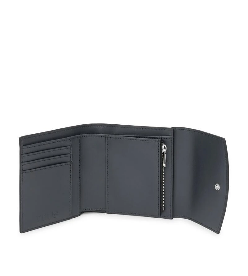 Cartera Flap TOUS Lucia de poliuretano en color gris oscuro. Cierre de solapa y botón a presión. En el interior cuenta con un compartimento abierto para billetes, un bolsillo con cremallera para monedas y cinco ranuras para tarjetas. Medidas (alto x ancho x fondo): 12 x 13 x 2 cm.