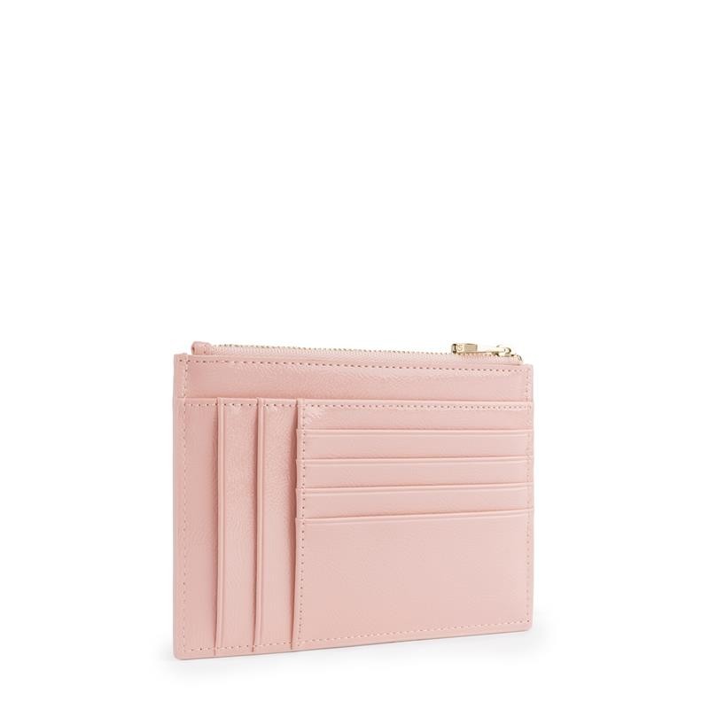 Cartera plana TOUS colección Dorp de vinilo efecto piel con acabado charol en color antique rosa. Cierre con cremallera. Apliques personalizados en tono dorado pálido. Cuatro compartimentos para tarjetas y seis compartimentos planos. Medidas: 11×15,7×5 cm.