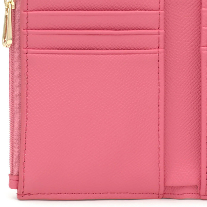 Cierre de botones a presión. En el interior cuenta con seis ranuras para tarjetas y un compartimento para billetes.