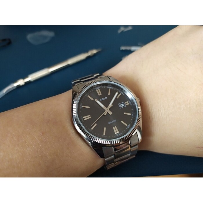 Este reloj Casio Collection MTP-1302PD-1A1VEF hombre, tiene la caja de acero inoxidable con forma circular de color plateado. El armis es de acero inoxidable y el bisel troquelado de color gris. Color de la esfera negro. El cristal es mineral, el movimiento cuarzo y el display analógico. Funciones: Tres agujas y calendario. 3 años 1 pila. Cierre de triple pliegue con un solo toque.