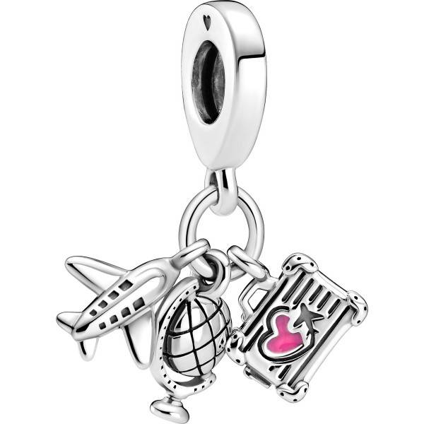 Charm Colgante Pandora Avión, Globo y Maleta. 3 charms en 1, esta joya en plata de primera ley es el sueño de cualquier amante de los viajes. Entre los detalles se incluyen ventanas ranuradas en el avión, líneas de latitud y longitud en el globo terráqueo y un corazón esmaltado a mano en color rosa en la maleta. Agrega este charm a tu colección de viajes como una promesa para planificar futuras aventuras o regálaselo a tu mejor amiga trotamundos.