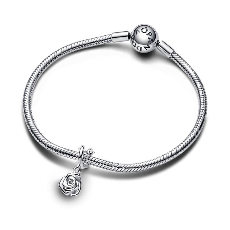 Valora el simbolismo de las flores con el Charm Colgante Rosa Floreciendo. Acabado a mano en plata de primera ley, este charm presenta una delicada rosa tridimensional con capas de pétalos que evocan la esencia del amor que florece. El reverso convexo pulido le aporta un toque de sofisticación, mientras que la anilla en plata de primera ley, que se asemeja al tallo de la rosa con espinas en relieve, le da un toque de realismo. Un símbolo del amor atemporal, este charm captura el gesto clásico de regalar una rosa interpretado con el toque único de Pandora.