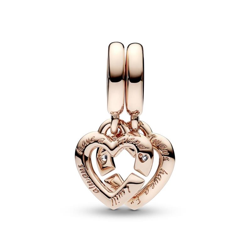 Charm Colgante Pandora Divisble para mujer Corazones de Hermanas fabricado en aleación de metales bañados en oro rosa de 14Kt. Compuesto por un doble charm colgante en forma de corazón.