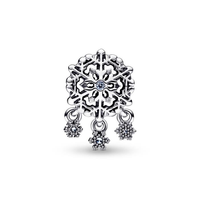 Charm Pandora para mujer Gota de Copo de Nieve fabricado en plata de primera ley en forma de copo de Nieve con 3 piezas colgantes también en forma de copos de nieve formados por circonitas azules.