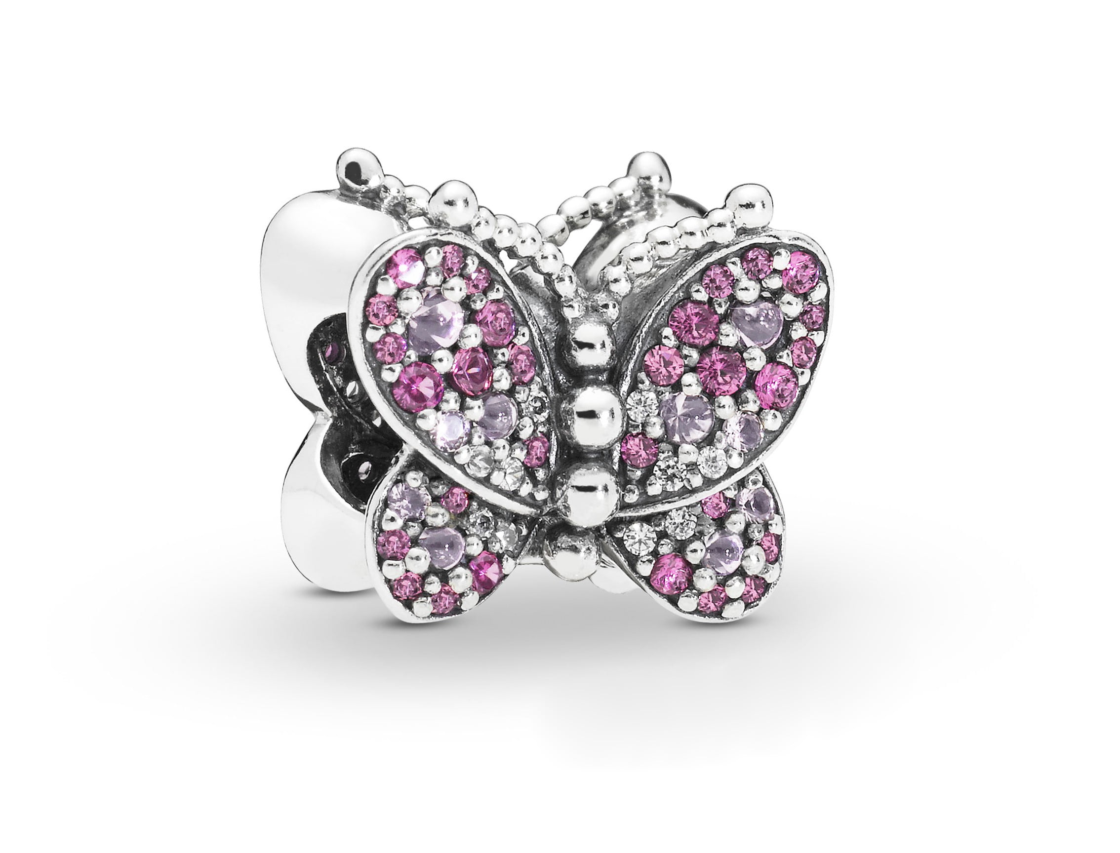 Charm Pandora Mariposa Rosa Deslumbrante en plata de primera ley, adornado con circonitas cúbicas transparentes y cristal rosa y cereza.