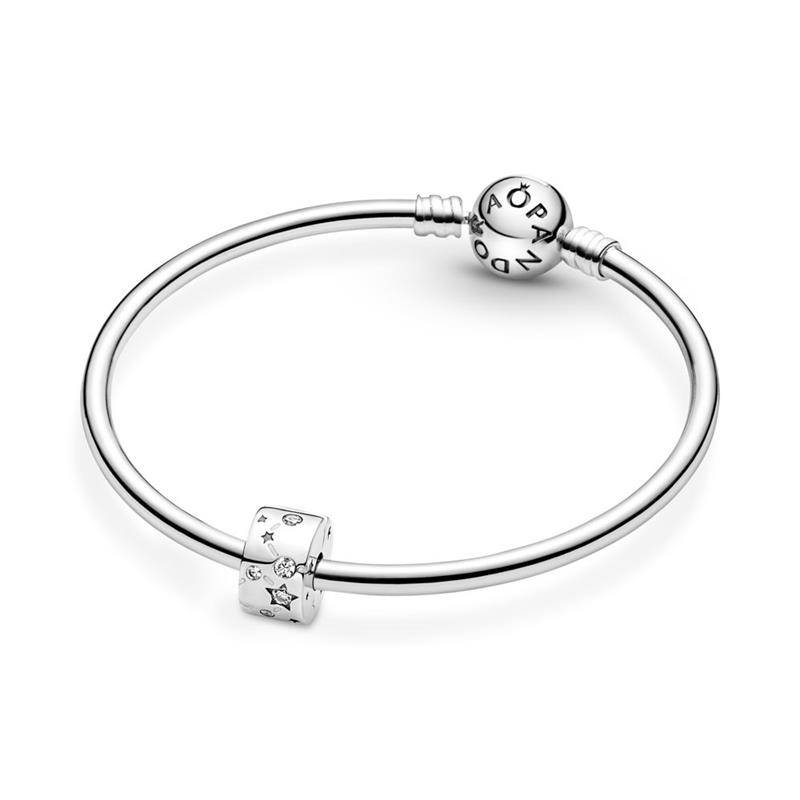 Clip Pandora Estrellas y Galaxia aportará toda la belleza de las estrellas a cualquier look. Este clip de inspiración celestial se presenta acabado a mano en plata de primera ley y embellecido con filas de circonitas cúbicas transparentes y estrellas recortadas grabadas. Las gemas y las estrellas están conectadas por brillantes rayas esmaltadas a manos en brillantes colores blanco y plata. Este clip no tiene agarres de silicona, por lo que solo se puede llevar en las roscas de tu pulsera. Añade este clip a tu pulsera y alcanza siempre las estrellas.