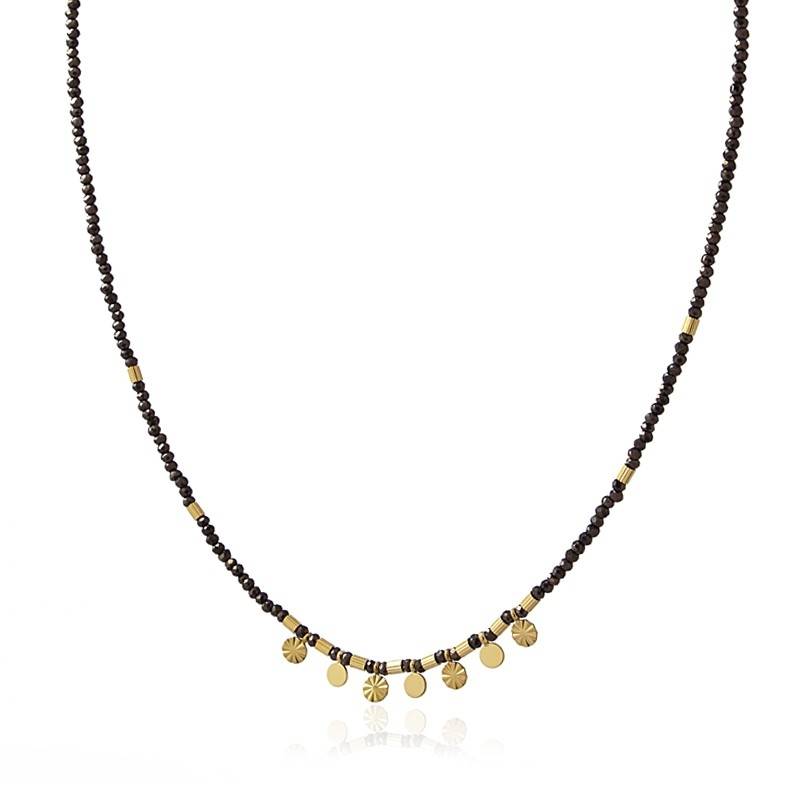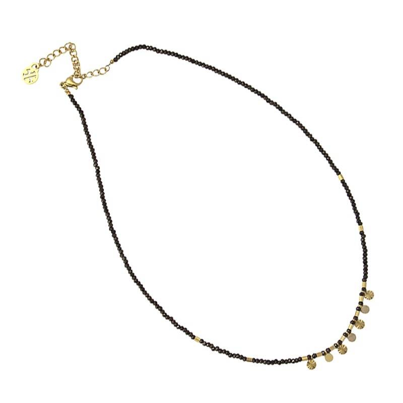 Collar en acero dorado con piedras naturales en color negro y adornos en acero dorado. Largo del collar 35+5cm