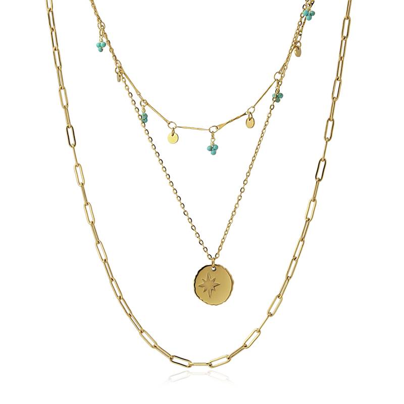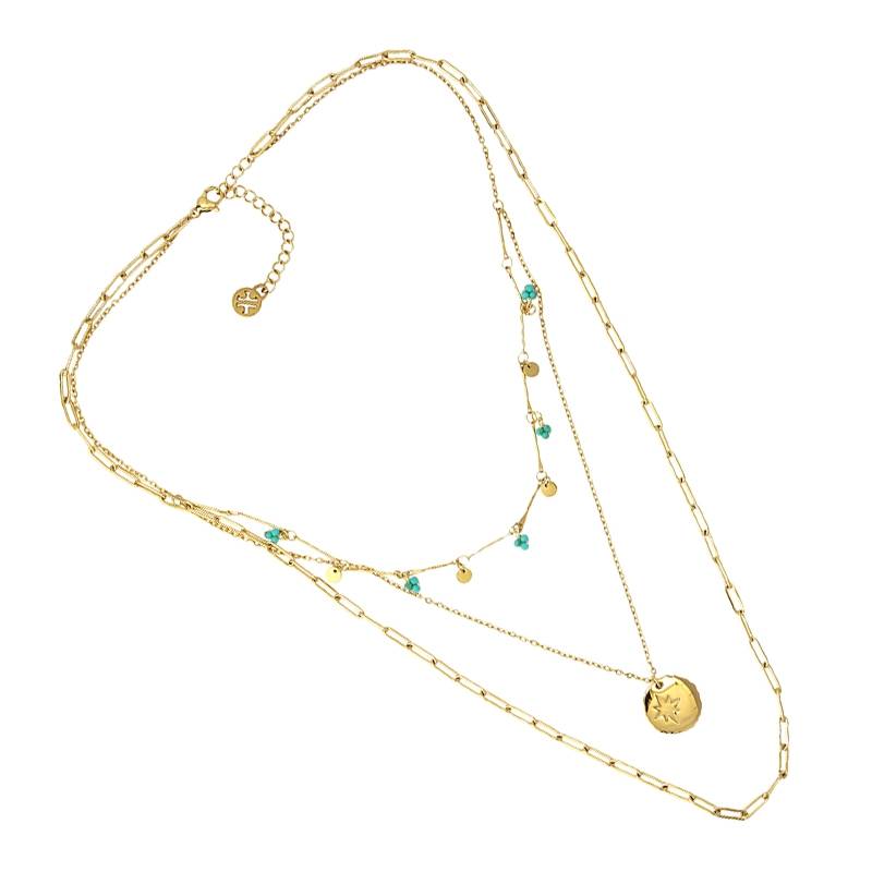 Collar en acero baño en oro con  triple cadena formado por juego de eslabones, pequeños abalorios en piedra y colgante tipo medalla. Largo del colllar 50cm + 5cm.