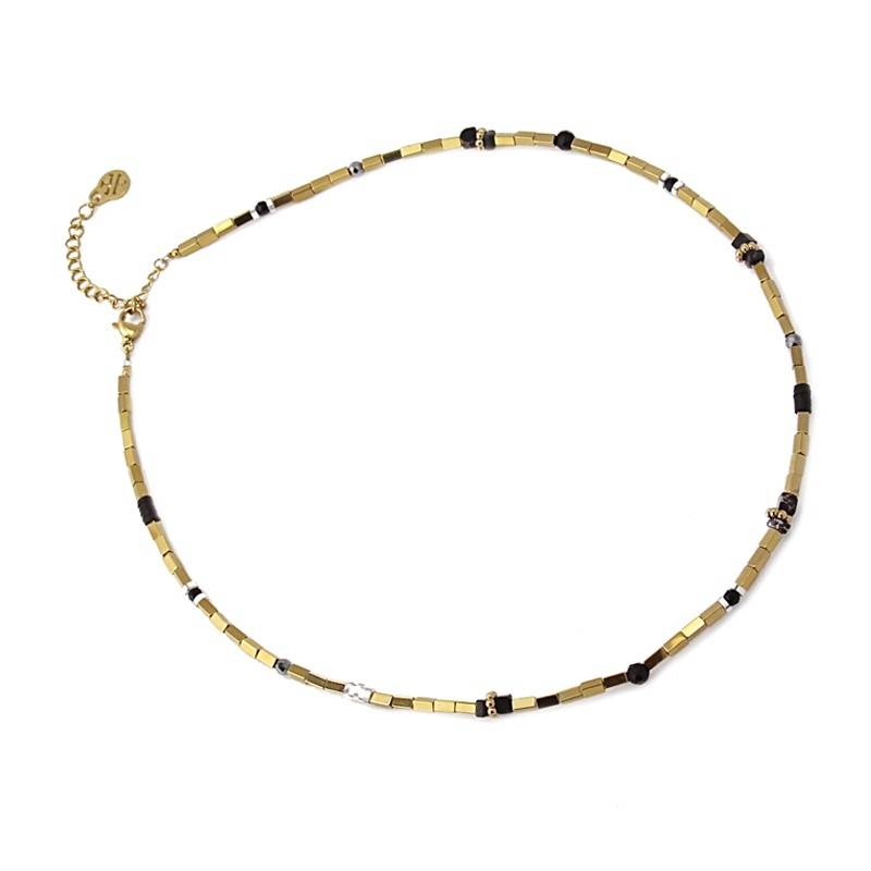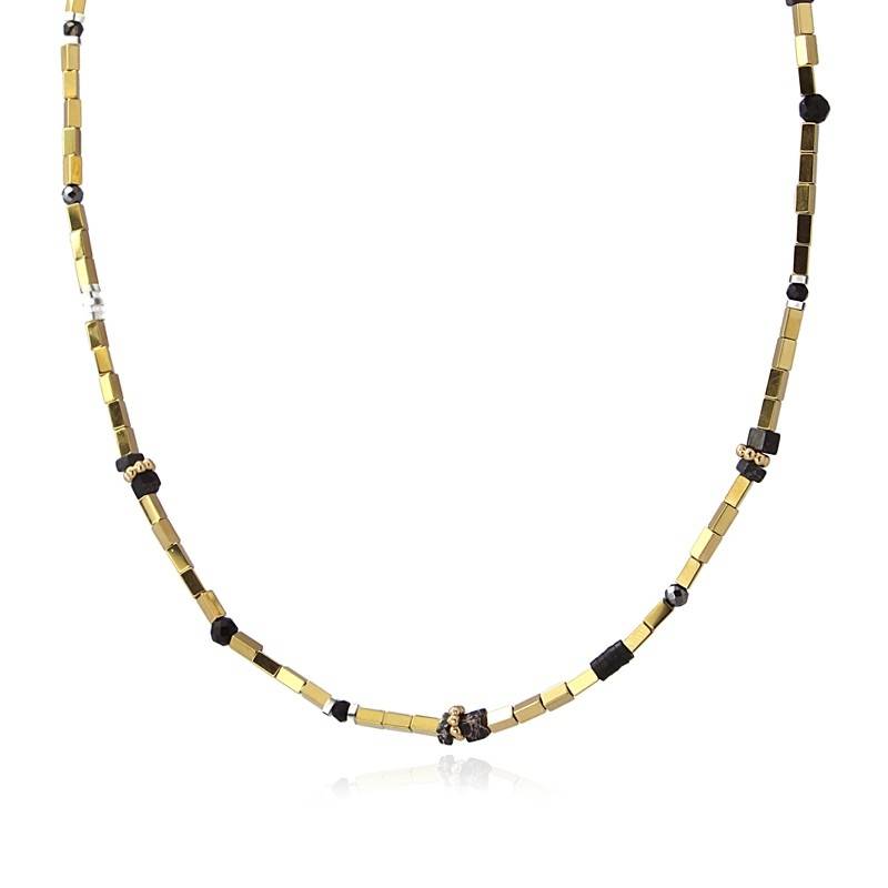 Collar en acero bañado en oro, formado por piezas tubulares metálicas y cuentas de piedra natural. Largo 40+5cm