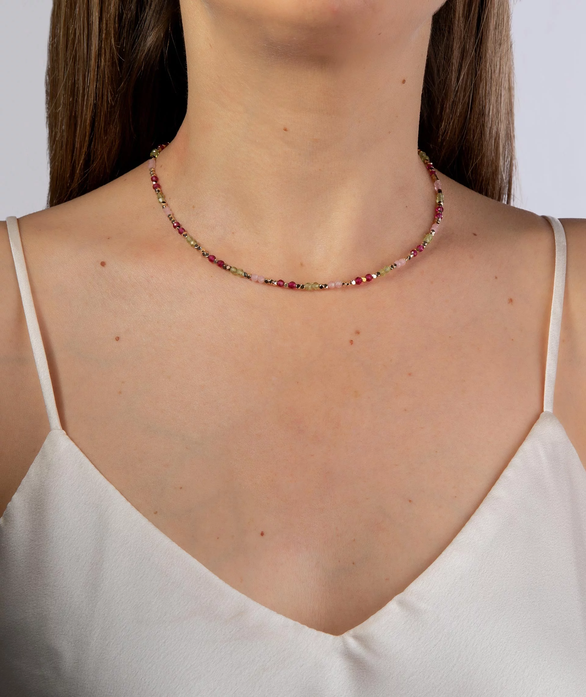Collar Colección True colors diseñada por María G. de Jaime chapado en Oro 18kt con piedras multicolor rosa y verdes. La colección está hecha con materiales naturales (perlas de río, piedras naturales) y puede haber una ligera variación en el tamaño de las perlas y las tonalidades de las piedras.