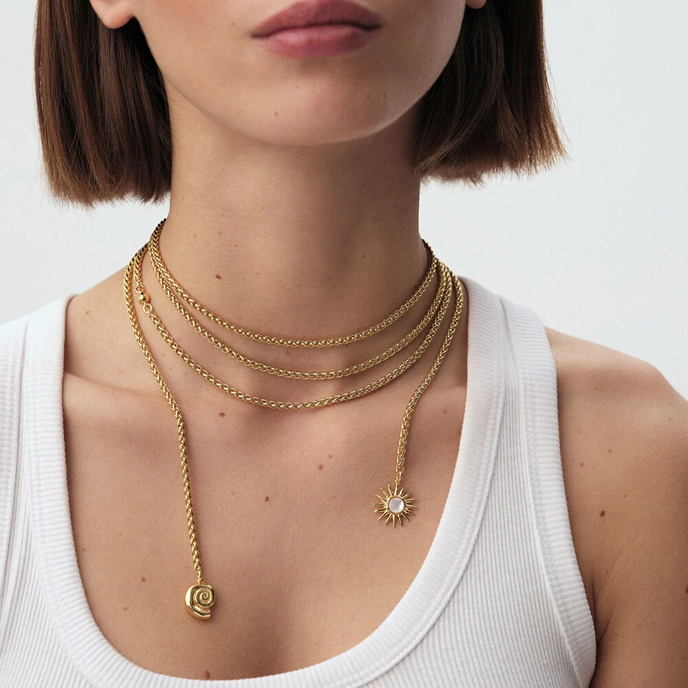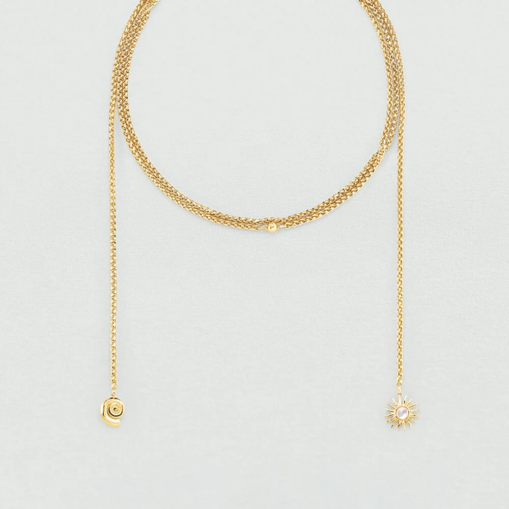 Collar multiposición acabado en oro con sol y caracola. Es una joya de lo más versátil porque hay 1000 formas de llevarla: como collar corto de varias vueltas, con nudo, largo, etc. La flor de Tiaré es una flor tahitiana que florece a la vez que el verano: de mayo a septiembre. Disfruta de la mejor época del año en forma de joya con la nueva colección de Maria Pombo X Agatha.