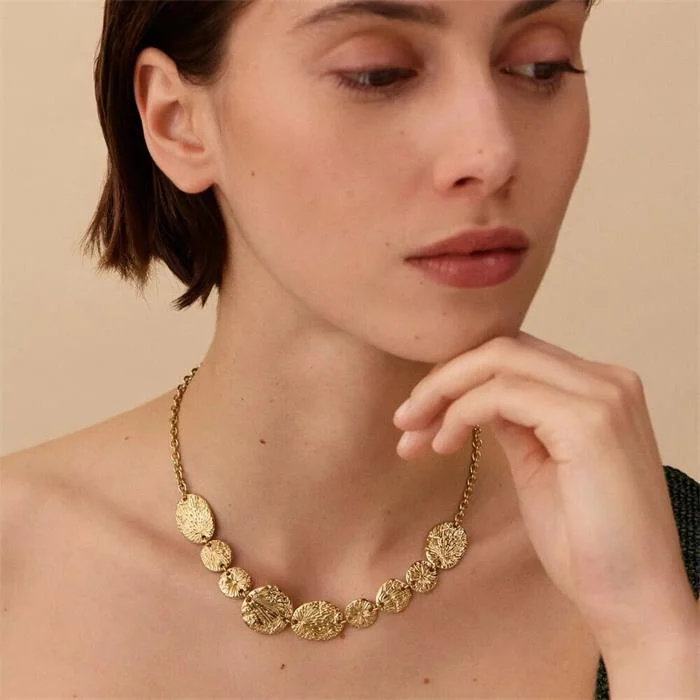Collar corto acabado en oro con varias medallas irregulares. Llevan un grabado súper original que imita los rayos del sol. Un collar para ponerte y no quitarte. Original, cómodo y tendencia, ¿Quién da más?