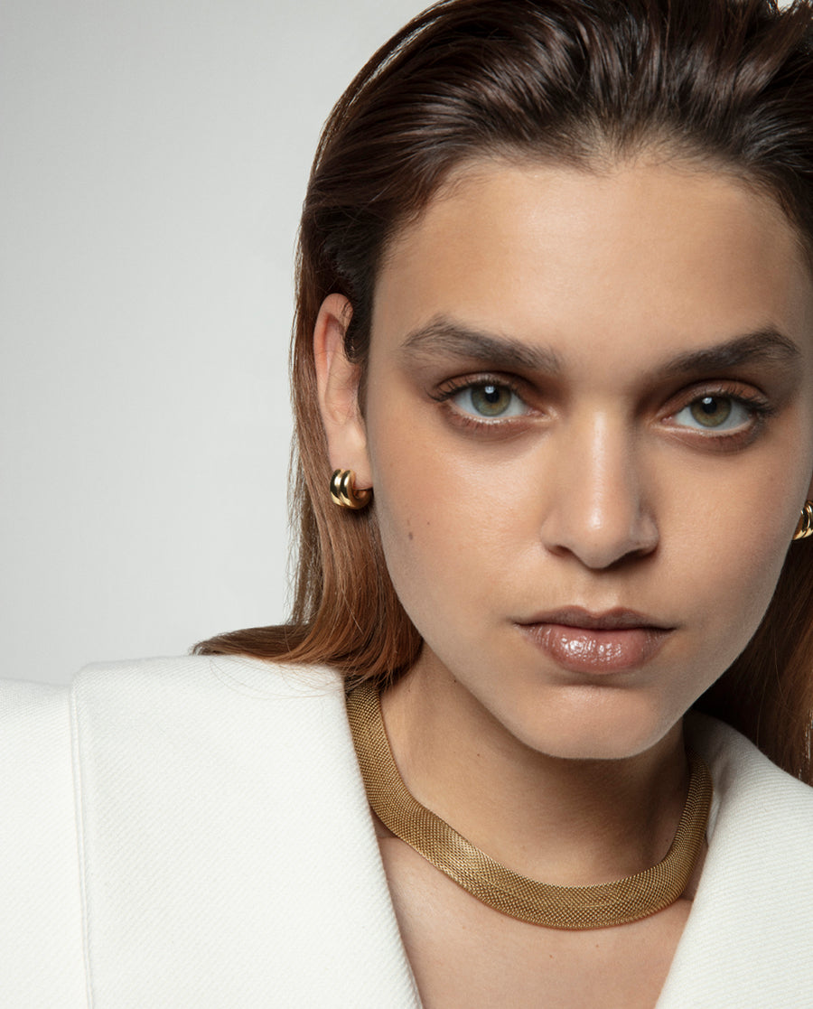 Este sofisticado collar de mujer de acero con acabado IP dorado y diseño mesh tubular ofrece una combinación de estilo moderno y elegancia.