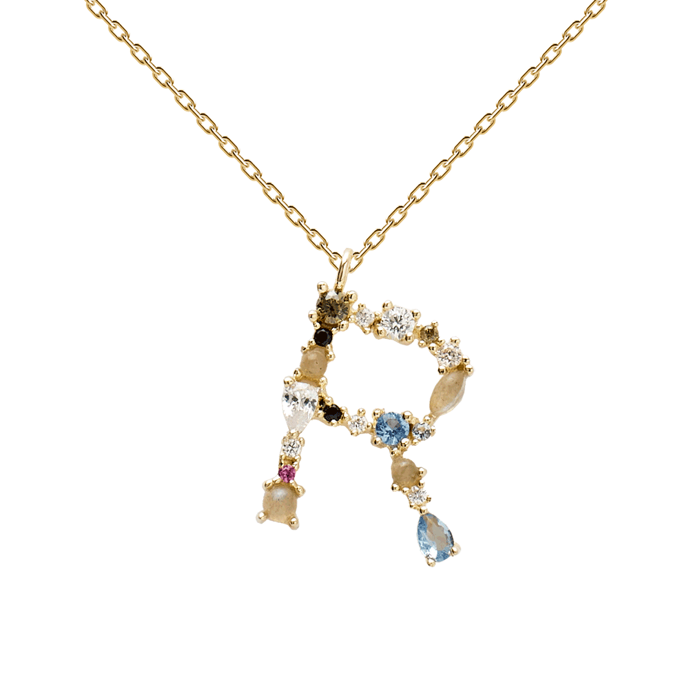 Collar inicial PD PAOLA, labradorita, aguamarina y circonitas en infinidad de tonalidades son las protagonistas en estas joyas talismán, delicadas piezas donde las piedras semipreciosas han sido talladas a mano para cada letra, forma y tamaño.