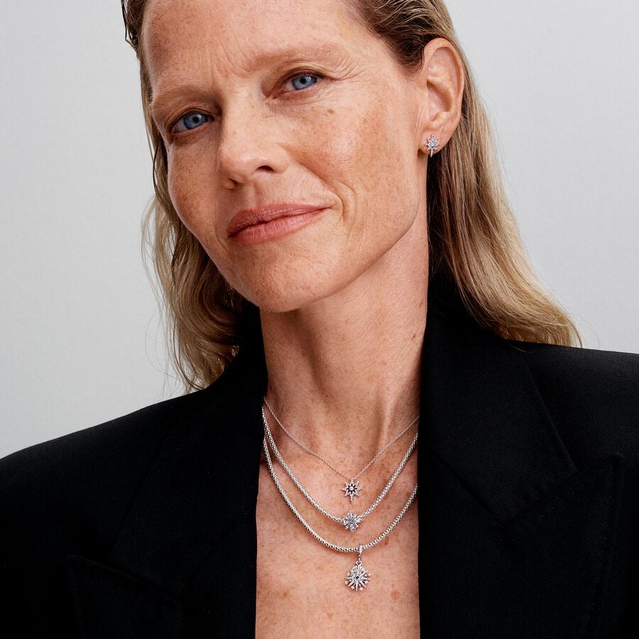Ilumina tu look con nuestro Collar Estrella Polar en plata de primera ley. Este collar presenta el simbólico diseño de la estrella polar con brillantes circonitas cúbicas transparentes colgando de una cadena de cable y aportará un brillo celestial a tu look con un simbolismo significativo. La cadena se puede ajustar a tres longitudes diferentes para adaptarla a tu estilo. La Estrella Polar, que sirve de brújula en momentos de incertidumbre, nos guía hacia un futuro más brillante y representa nuestras esperanzas y anhelos. Póntelos para dar brillo a cualquier look festivo o regálaselo a esa estrella brillante de tu vida.
