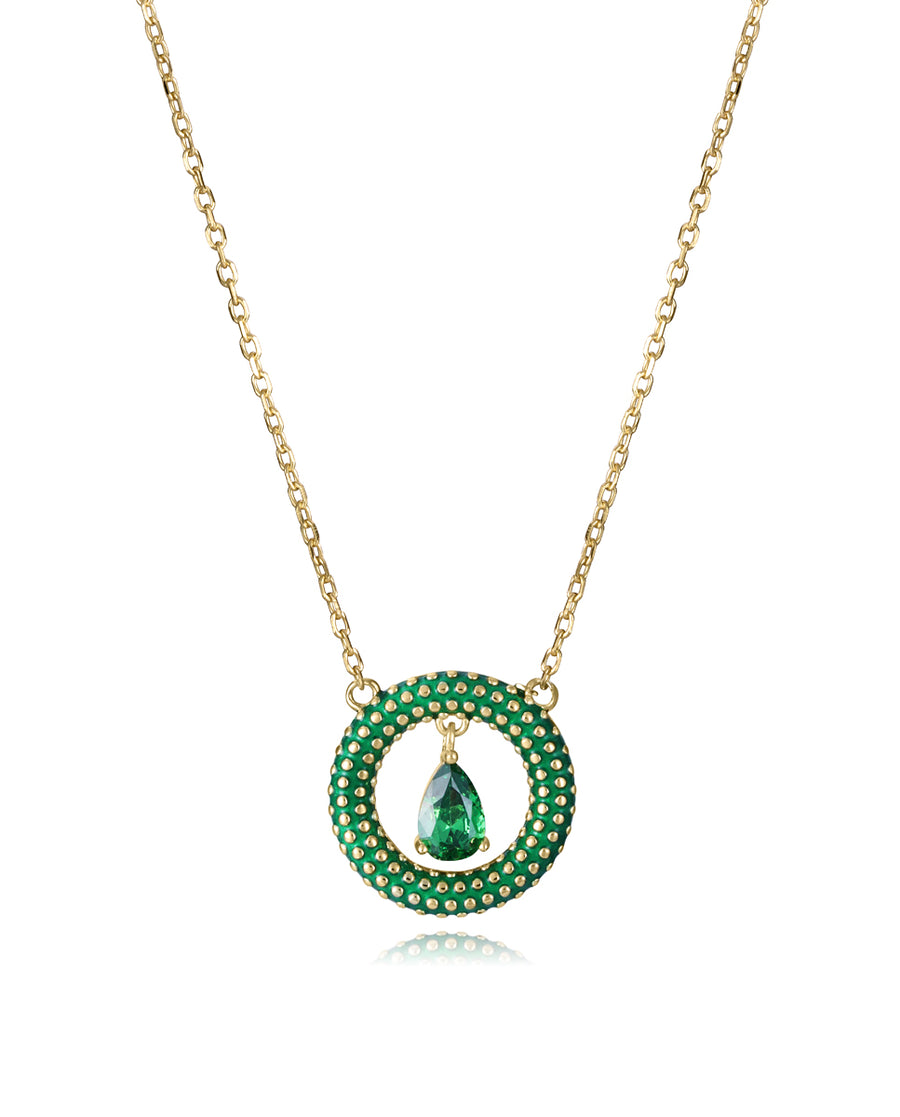 Este elegante collar de plata de primera ley con baño de oro presenta un diseño sofisticado con un aro adornado con esmalte verde, complementado por una brillante circonita verde en el colgante. El contraste entre el esmalte verde y el brillo del oro crea un estilo moderno y refinado, ideal para la mujer que busca un accesorio distintivo que combine color, elegancia y lujo. Perfecto para realzar cualquier look con un toque de frescura y sofisticación. Largo 42 + 3 cm.