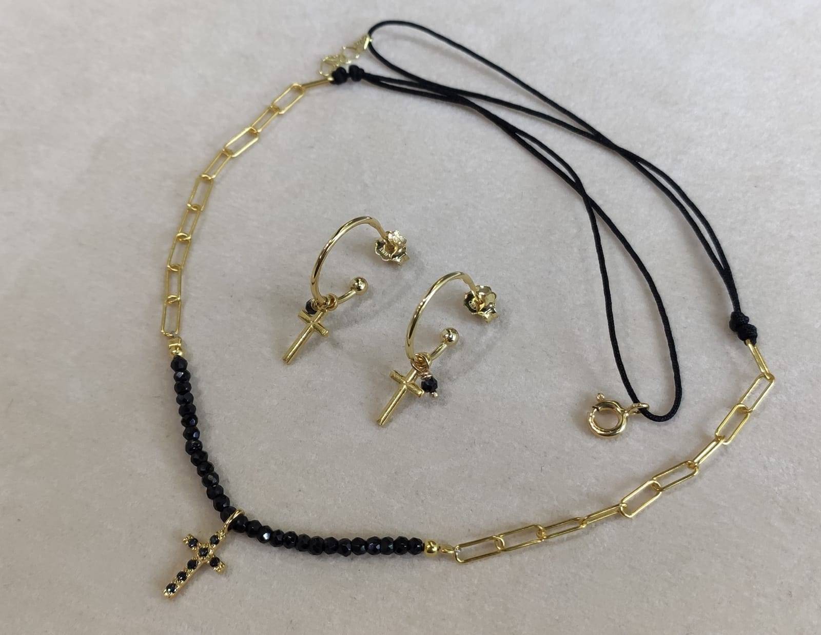 Gargantilla combinada con plata ip dorada e hilo de arco don y espinela negra. Cruz central de plata ip dorada y circonitas negras.
