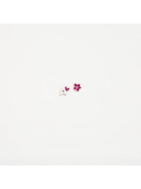 Pendientes Agatha Ruiz de la Prada para mujer de la colección Abecedario fabricados en plata en forma de Letra A con un pequeño corazón en color rosa, el otro pendiente es en forma de flor con esmalte rosa. Su cierre es de presión.