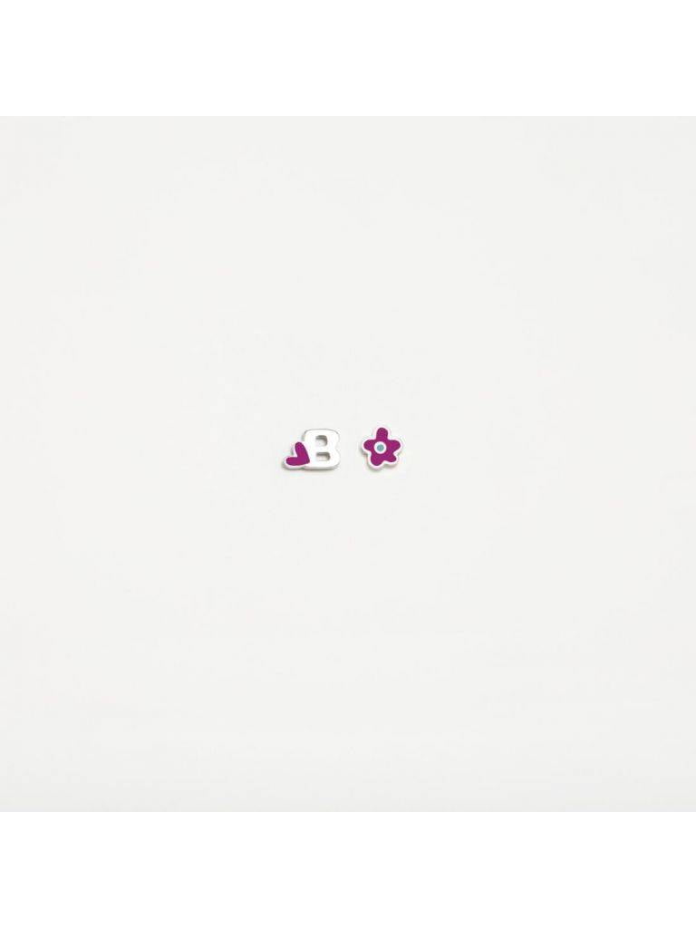 Pendientes abecedario en plata de ley, letra B con un corazón y una flor con esmalte morado.