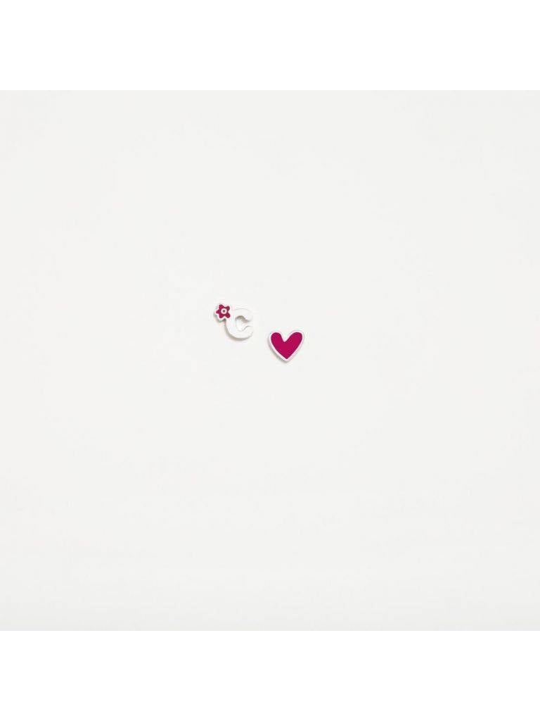 Pendientes Agatha Ruiz de la Prada para mujer de la colección Abecedario fabricados en plata en forma de Letra C con una pequeña flor en color rosa, el otro pendiente es en forma de corazón con esmalte rosa. Su cierre es de presión.
