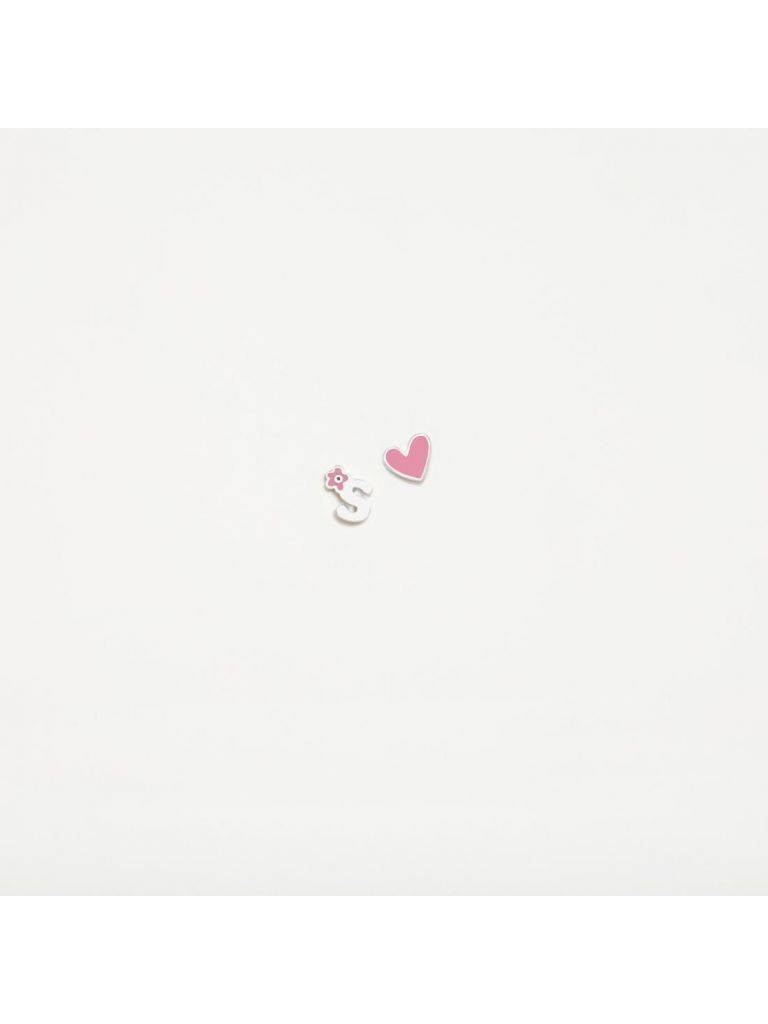 Pendientes Agatha Ruiz de la Prada de la colección Abecedario para mujer o niña fabricados en plata de primera ley. Se trata de unos originales y coloridos pendientes uno de ellos en forma de Letra S con un detalle en forma de corazón con esmalte rosa, el otro pendiente es en forma de flor con esmalte rosa. Su cierre es de presión.