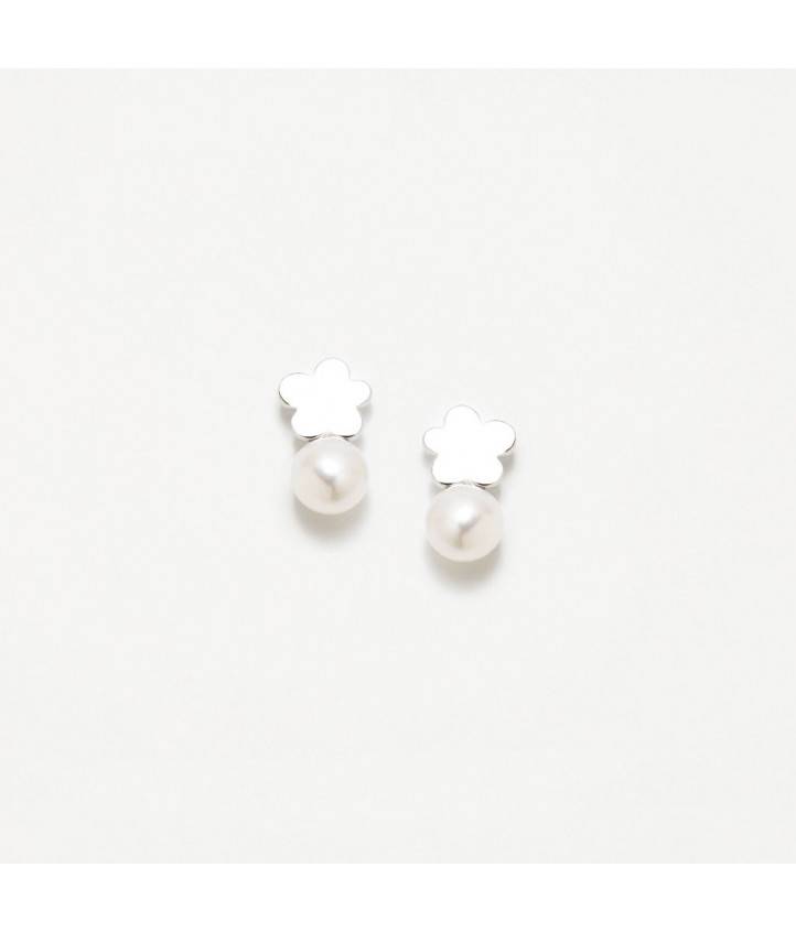 Pendientes Agatha flor lisa en plata de ley adornados con perla natural. Cierre de presión.