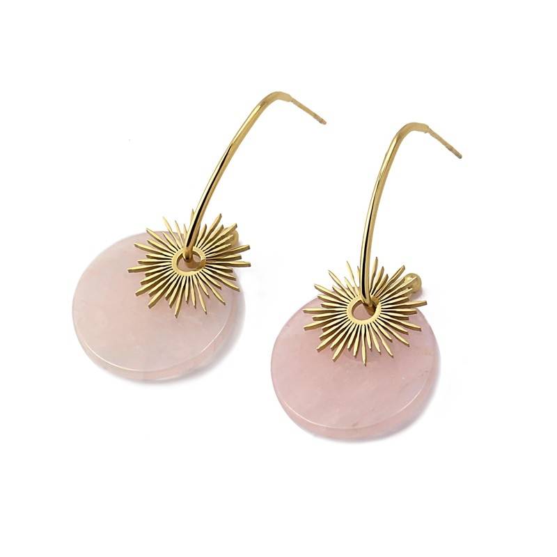 Pendientes Anartxy en acero bañado en oro con charm en forma de Sol y disco de cuarzo rosa con cierre presión. Largo del pendiente 38mm.