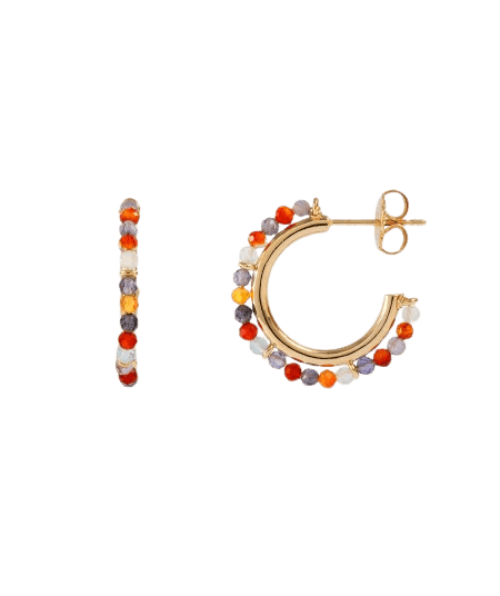 Pendientes Aro Colección True colors diseñada por María G. de Jaime chapado en Oro 18kt con piedras multicolor Lila, naranja y blanco, su cierre es de presión y su diámetro 20,5 x 2,5 mm. La colección está hecha con materiales naturales (perlas de río, piedras naturales) y puede haber una ligera variación en el tamaño de las perlas y las tonalidades de las piedras.