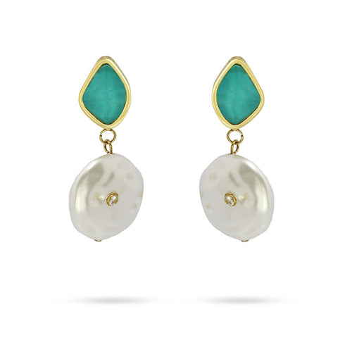 Pendientes largos de acero quirúrgico dorado formados por pieza de cristal coloreado y perla colgante con circonita. Los puedes elegir en color turquesa o fucsia y son perfectos para llevar en eventos formales de día o cenas con amigos. Miden 40 mm de largo. Llevan pasador con cierre a presión tipo mariposa y no producen alergia.