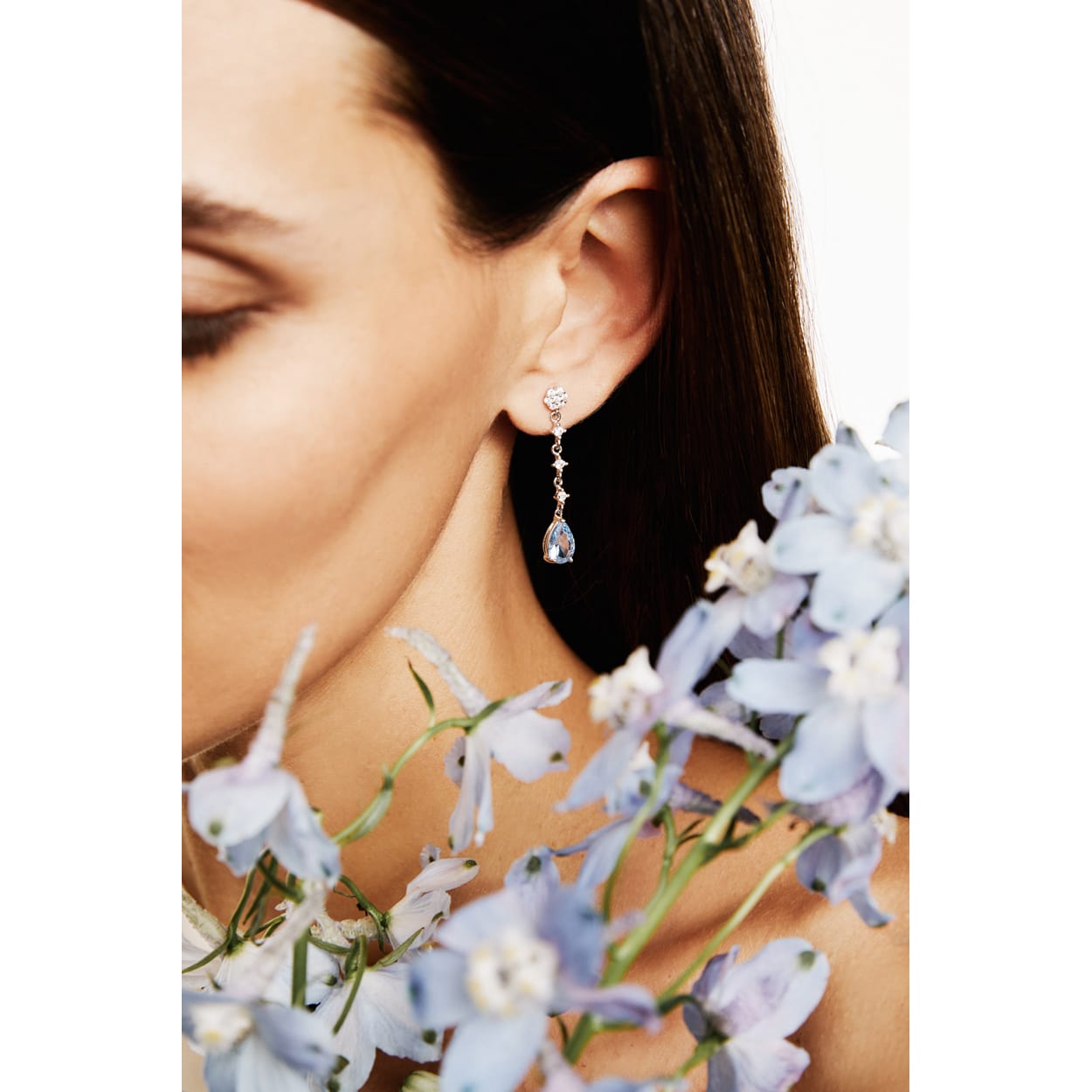 Pendientes de Durán Exquse de la colección Sposatoa de plata con circonitas y una circonita en forma de lagrima al final en azul agua marina. Cierre de presión. 4cm de longitud