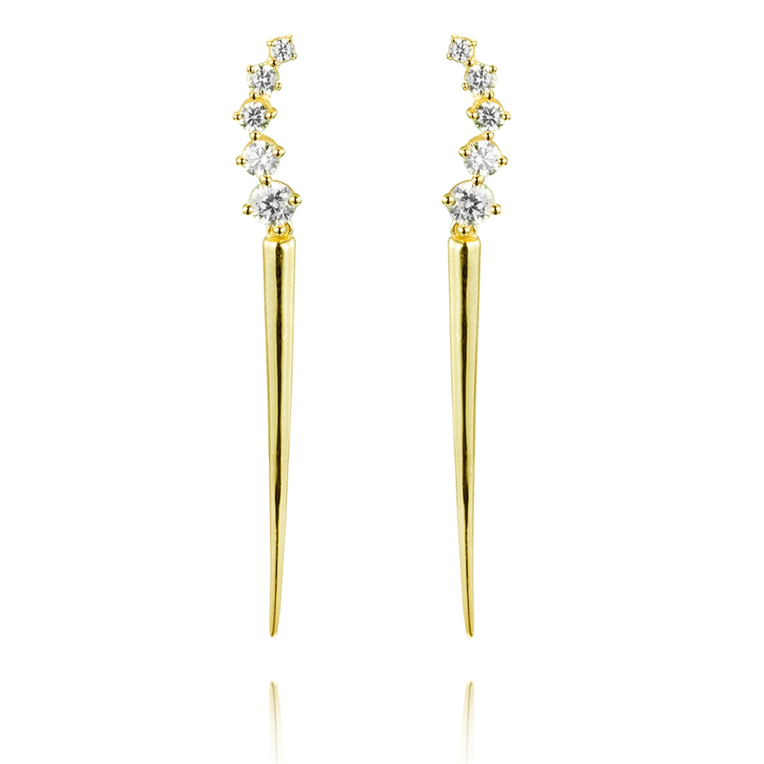 Pendientes de plata bañados en oro, con cierre presión. Su forma de palo dorado y en la parte superior 5 circonitas de diferetes tamaños.