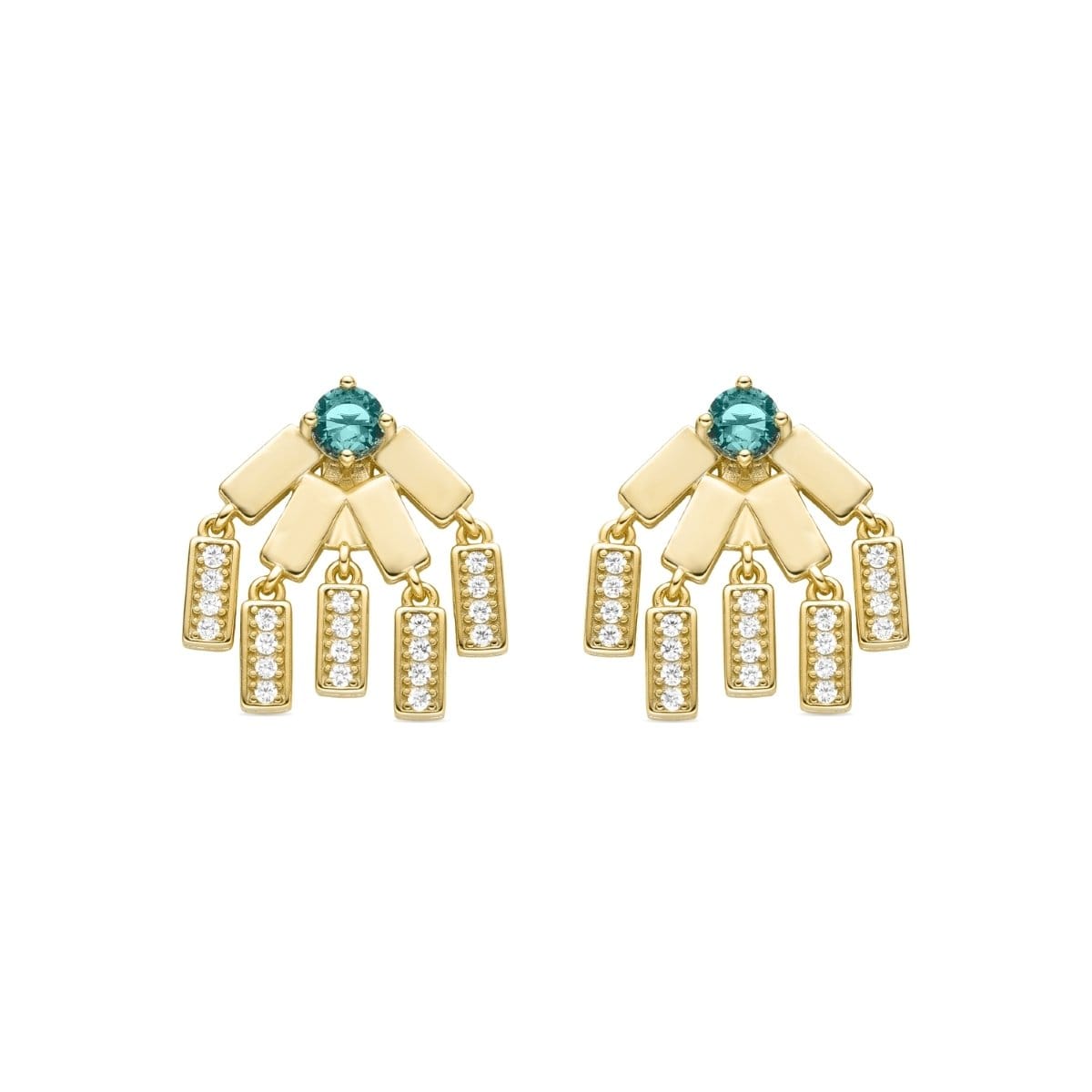 Pendientes Paiga acabados en oro amarillo de 18 quilates con circonitas y piedra verde, cierre de presión. África se convierte en la línea perfecta para mujeres con personalidad, que no temen arriesgar y lucir piezas con carácter propio. Un viaje a nuestros orígenes.