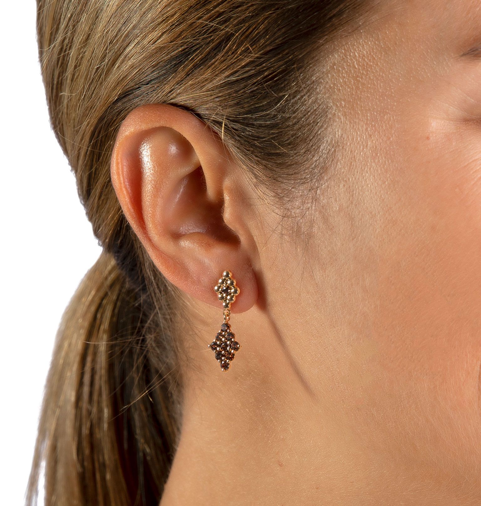 Pendientes largos Colección Respira diseñada por María G. de Jaime acabado Oro 18kt con doble rombo de circonitas Marrones. La estética vintage, la calidad en los acabados, y el dorado dignos de brillar en una gran noche de celebración.