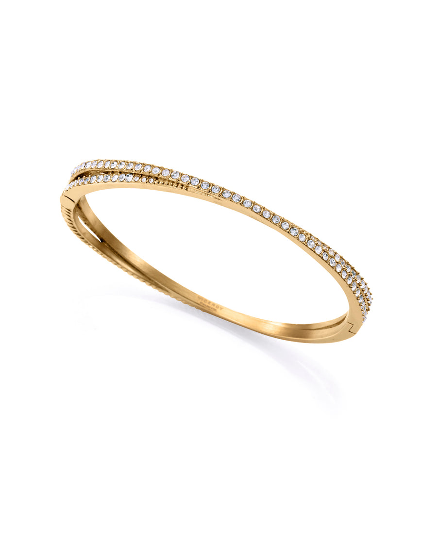Pulsera rígida de acero con acabado IP dorado, diseñada para la mujer que valora el estilo y la sofisticación. Esta elegante pieza está adornada con un cristal blanco que, con su brillo delicado, captura la luz de manera sutil, aportando un toque de luminosidad refinada. Su estructura rígida garantiza un ajuste cómodo y seguro, mientras que el dorado le otorga un aire de lujo discreto y atemporal. Es el complemento perfecto para cualquier ocasión, desde el día a día hasta eventos más formales. Diámetro 6 cm.