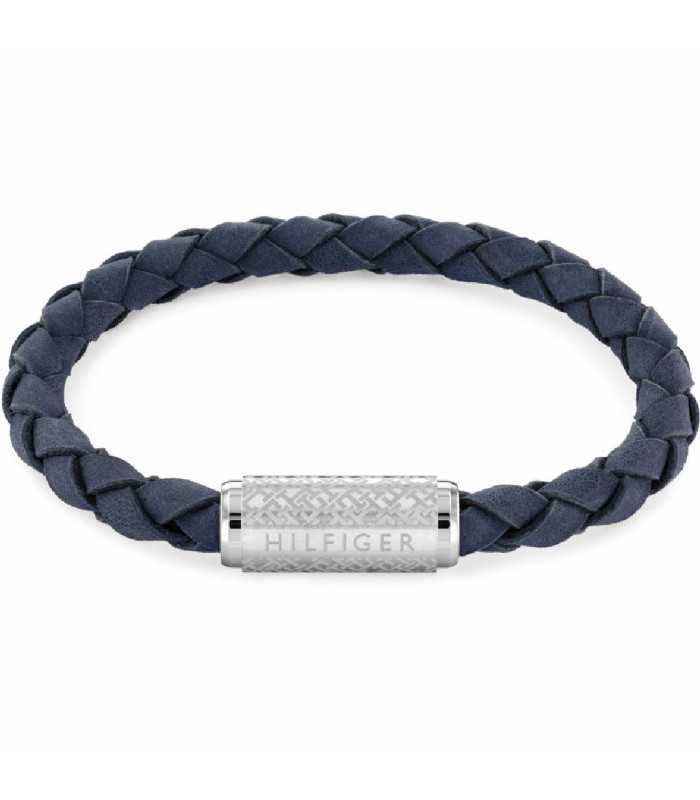 Pulsera de hombre con cierre giratorio magnético ajustable que es elegante y fácil de usar. Cuero azul trenzado con cierre de acero inoxidable y grabado con Hilfiger y el icónico monograma de la marca TH.