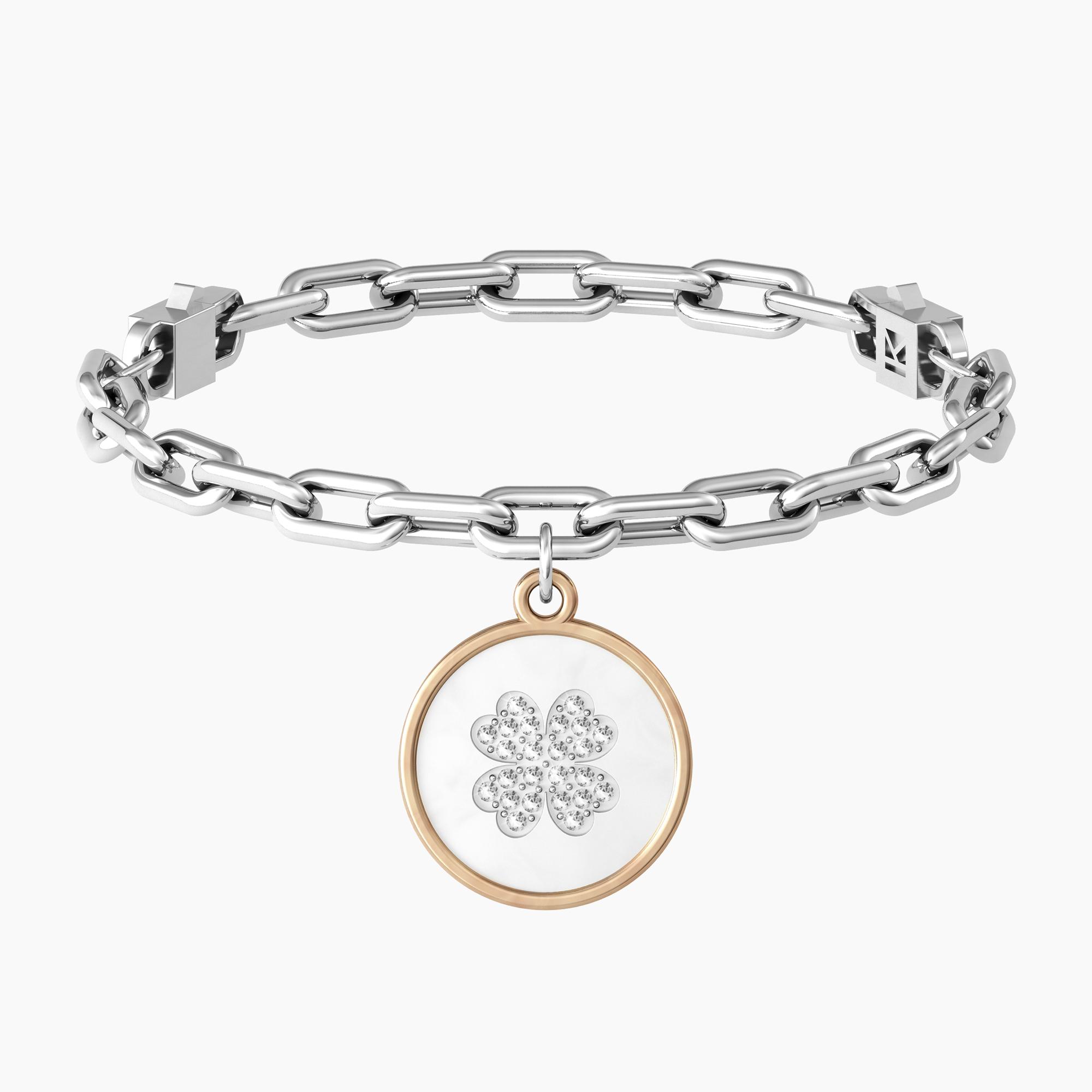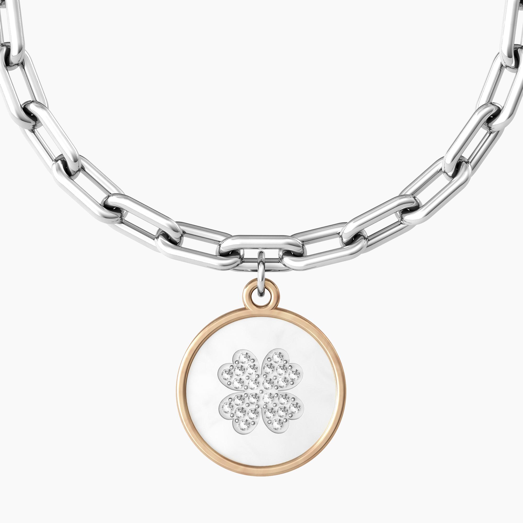 Pulsera de acero con cadena de mallas ovales «comfort fit» y colgante satinado redondo con trébol de cristales y acabado color oro rosa.