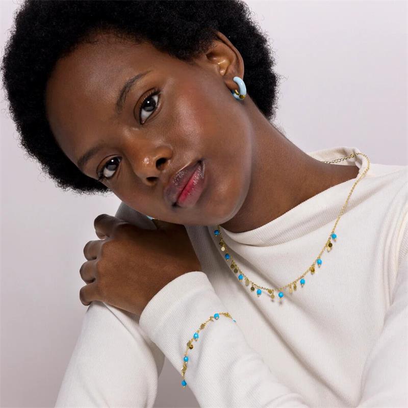 Pulsera Lux by Lux para mujer modelo Fawya fabricada en acero bañado en oro amarillo de 18Kt compuesta por chapitas colgantes y piedras turquesa. Su cierre es de mosquetón ajustable mediante cadena extensible.
