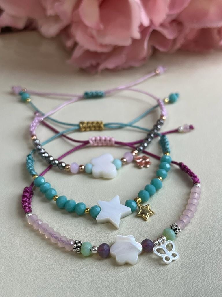 Pulsera de niña con flor de nácar y piedras rosas, verdes y moradas con flor de plata colgando. Terminada en algodón con cierre de macramé