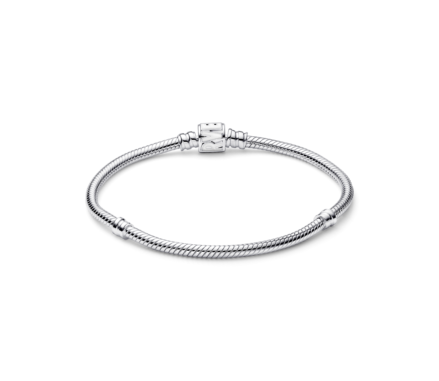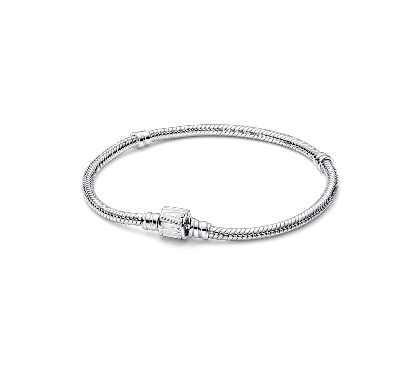 Pulsera Pandora Moments para mujer de la colección Marvel fabricada en plata de primera ley compuesta por cadena de serpiente con cierre que posee el logo de Marvel con esmalte blanco.