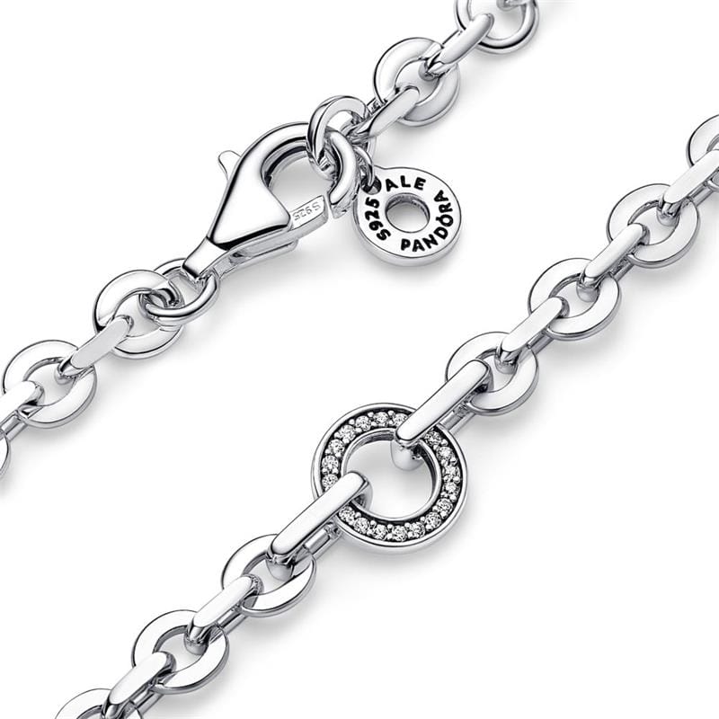 Pulsera Pandora Signature Cadena Gruesa Pavé para mujer de la colección Avance de Otoño 2023 fabricada en plata de primera ley formada por una cadena de diseño grueso con un abalorio en forma de aro con circonitas engastadas en pavé. Su cierre es de mosquetón.