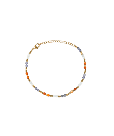 Pulsera Colección True colors diseñada por María G. de Jaime chapado en Oro 18kt con piedras multicolor Lila, naranja y blanco. La colección está hecha con materiales naturales (perlas de río, piedras naturales) y puede haber una ligera variación en el tamaño de las perlas y las tonalidades de las piedras.